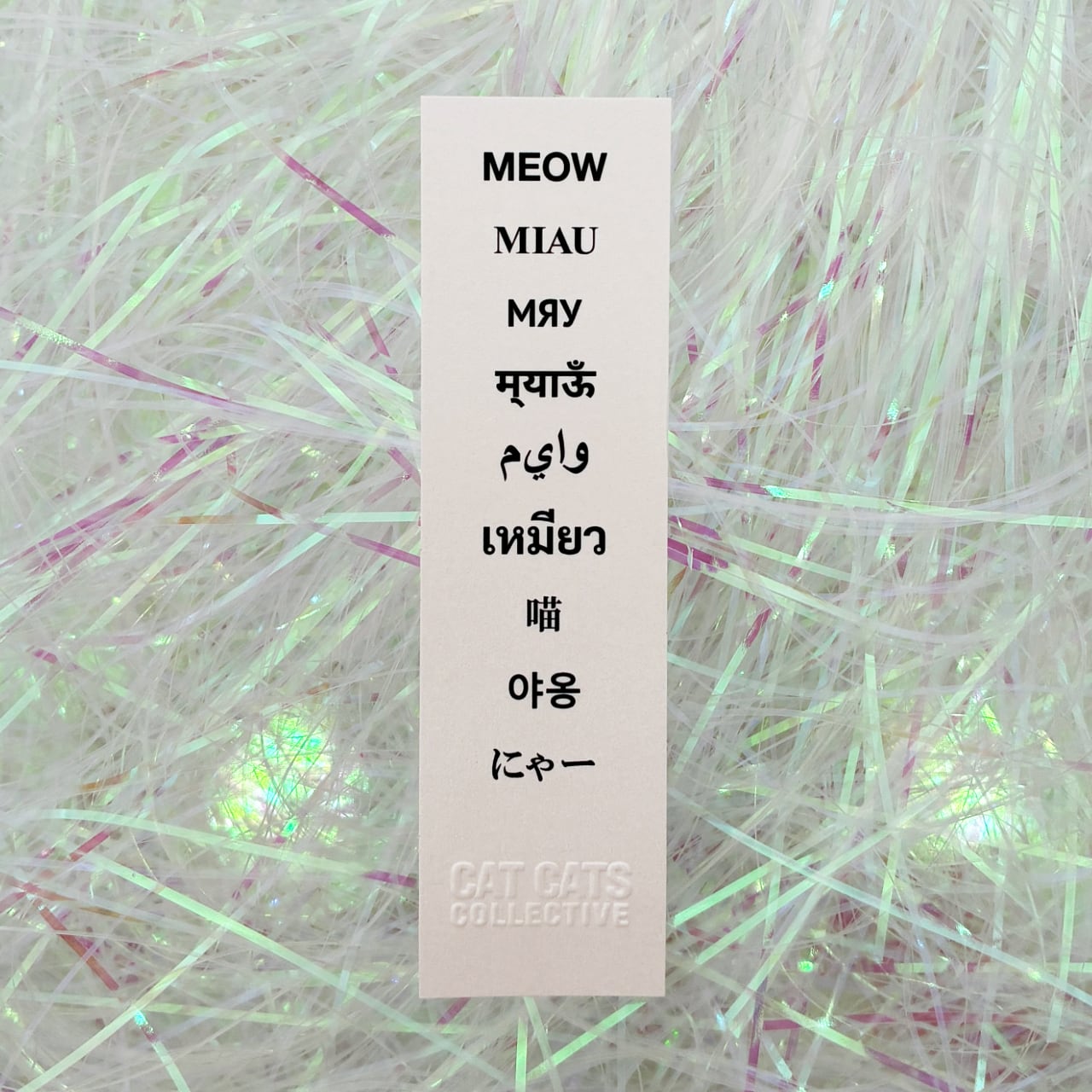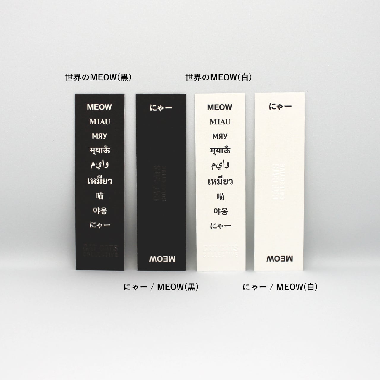 猫の鳴き声「にゃー」「MEOW」をモチーフにした、CAT CATS COLLECTIVE オリジナルのしおりです。
